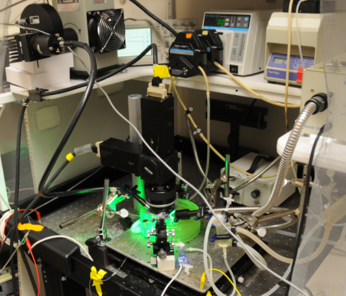 Dual Calcium-Voltage Optical Mapping: Two cameras are positioned over a mouse heart. One will capture surface voltage changes, while the other captures calcium gradients